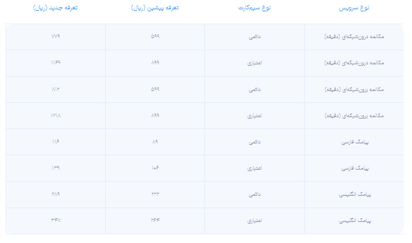 در جدول زیر تغییرات قیمتی خدمات اصلی اپراتورها قابل مشاهده است: